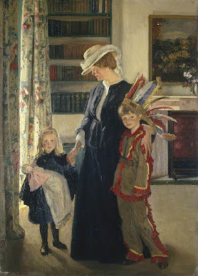 Harrington Mann seems to have done quite a number of paintings of girls and their toys, which is a weird thing to specialize in but we all have to make a living. The disarray of playthings around her feet might signify the riches Annabel's family enjoys, or the opportunities on offer because of her position in life. More likely it's about the fact that no matter what surrounds her, Annabel's only opportunity is to become a mother, have a little Annabel of her own. I suspect the doll is wearing a christening gown (which are unfeasibly long and impractical) - maybe it is Annabel's own gown? The mother in me does want to shout 'look at the state of your room' when looking at this painting...